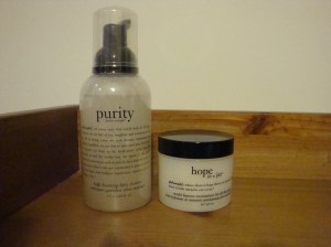 A  while back, I did a review on Philosophy’s moisturizer, Hope in a Jar, and promised that I would do a follow-up on Hope in a Jar and a review of the cleanser, Purity Made Simple, since I bought them together. (Click here for the review on Purity Made Simple).