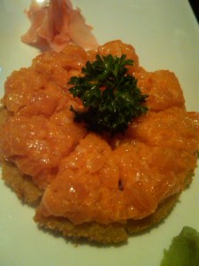 Before our appetizers, they served complimentary warm noodles w/ broth in mini bowls which was a nice touch. To start, we had the Beef and Enoki Roll and Spicy Salmon Pizza. The Beef and Enoki Roll was not done the traditional way, instead Sushi Moto served almost like a maki roll – deep fried and cut into pieces. The batter was a bit heavy for what is supposed to be a light dish although I did like the fact that the enoki mushrooms were plentiful and crisp. The Spicy Salmon Pizza was much better. The rice was crunchy and the topping of Spicy Salmon was flavorful and fresh.
