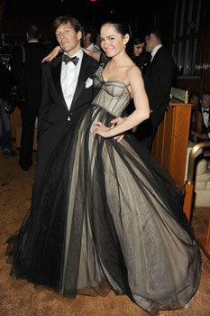 “Mr. Mendel’s best friend, Dr. Lisa Airan, wore a Couture Taupe Gazaar and Black Tulle Layered Gown with Structured Bodice and Diamante Sculpted Mesh Embroidered Shoulder. Initially moved by his collaboration with the New York City Ballet, Mendel created this one of-a-kind gown that was inspired by classic couture and given a twist for the modern, American woman.”