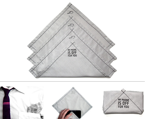 The PHONEKERCHIEF (that’s what it’s called!) blocks any signal going to your phone, wrap it up and put it aside and people will know you’re all theirs!