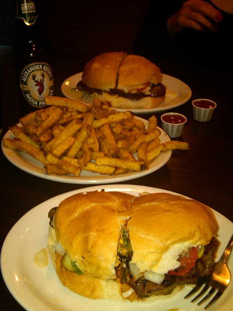 Solmaz and I ordered the steak on a kaiser ($5.99) … which is basically just a big piece of steak between a bun. We also ordered a plate of fries ($3-4?) to share and a bottle of Keith’s (for moi) and a diet coke (for Solmaz.) We had a choice of toppings and sauces to accompany our “steak burger” which the server added when we were at the counter to pick up our food.