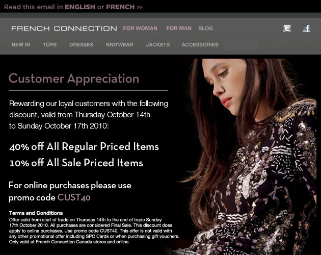 French Connection Up To 40% Off! Posted on October 13, 2010May 12, 2013 by Solmaz You all probably got this email in your inboxes today, but if you didn’t here it is… Use the code provided to shop online or just show up at the FCUK store anywhere in Canada. (Sorry US shoppers!) Happy shopping! sa 43.642265 -79.374871 Share this:Tweet Click to share on Reddit (Opens in new window) Reddit Share on Tumblr Click to email a link to a friend (Opens in new window) Email More Click to print (Opens in new window) Print PocketLike Loading... Related