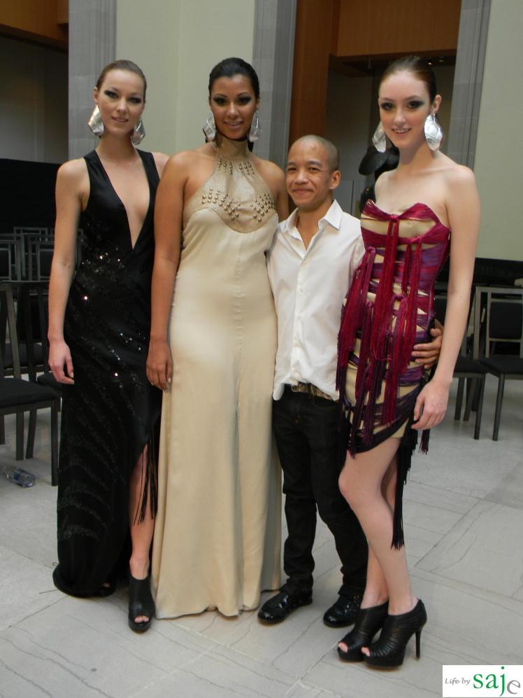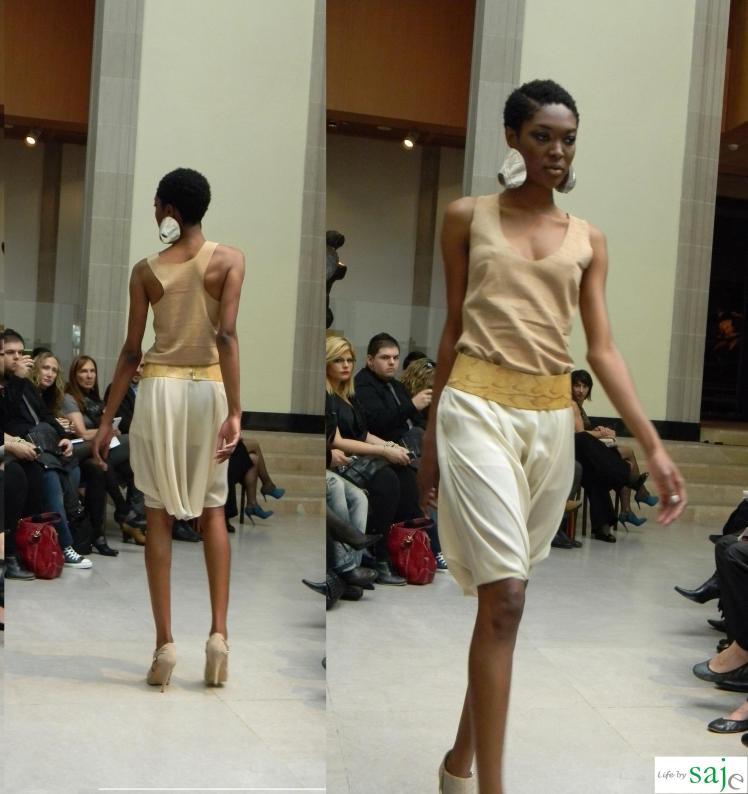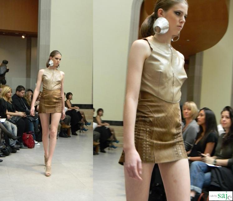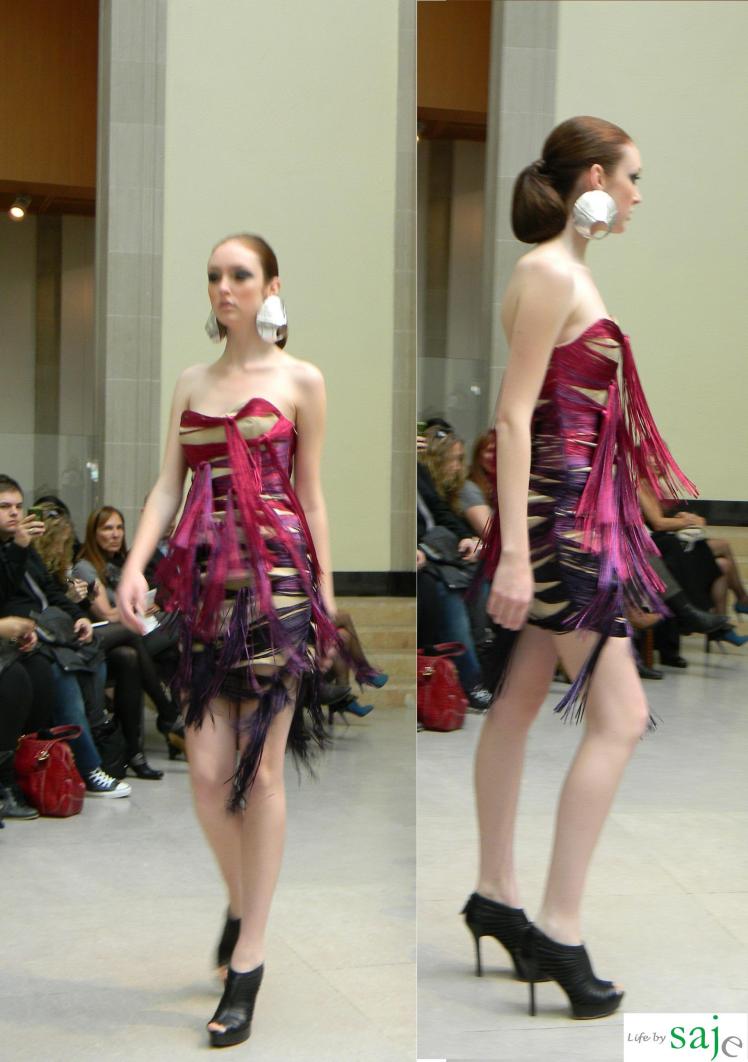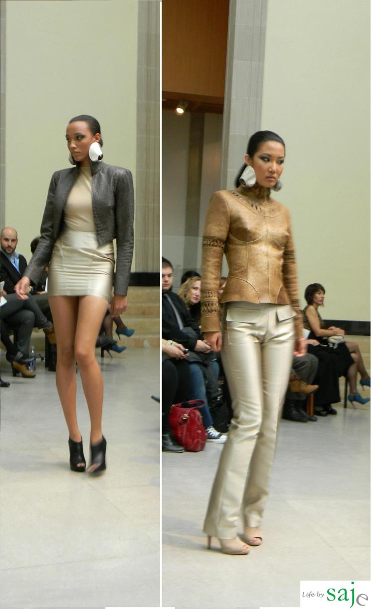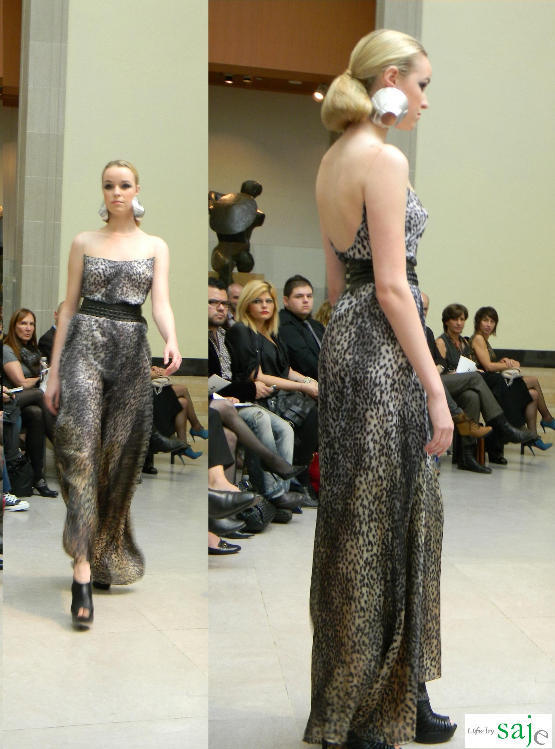 Today Canadian fashion designer Sunny Fong took us on a journey to Africa and Spain with his SS2011 collection for VAWK; inspired by his virtual tour of these amazing countries. The Toro Safari collection was a beautiful marriage between soft flowy feminine fabrics and buttery leather in shades of gold, cream and sand, mixed with dark animal prints and an amazing single pop of fuschia and purple for the strapless knotted fringe dress. The runway was set in VAWK’s favorite Toronto location at AGO’s Walker court.