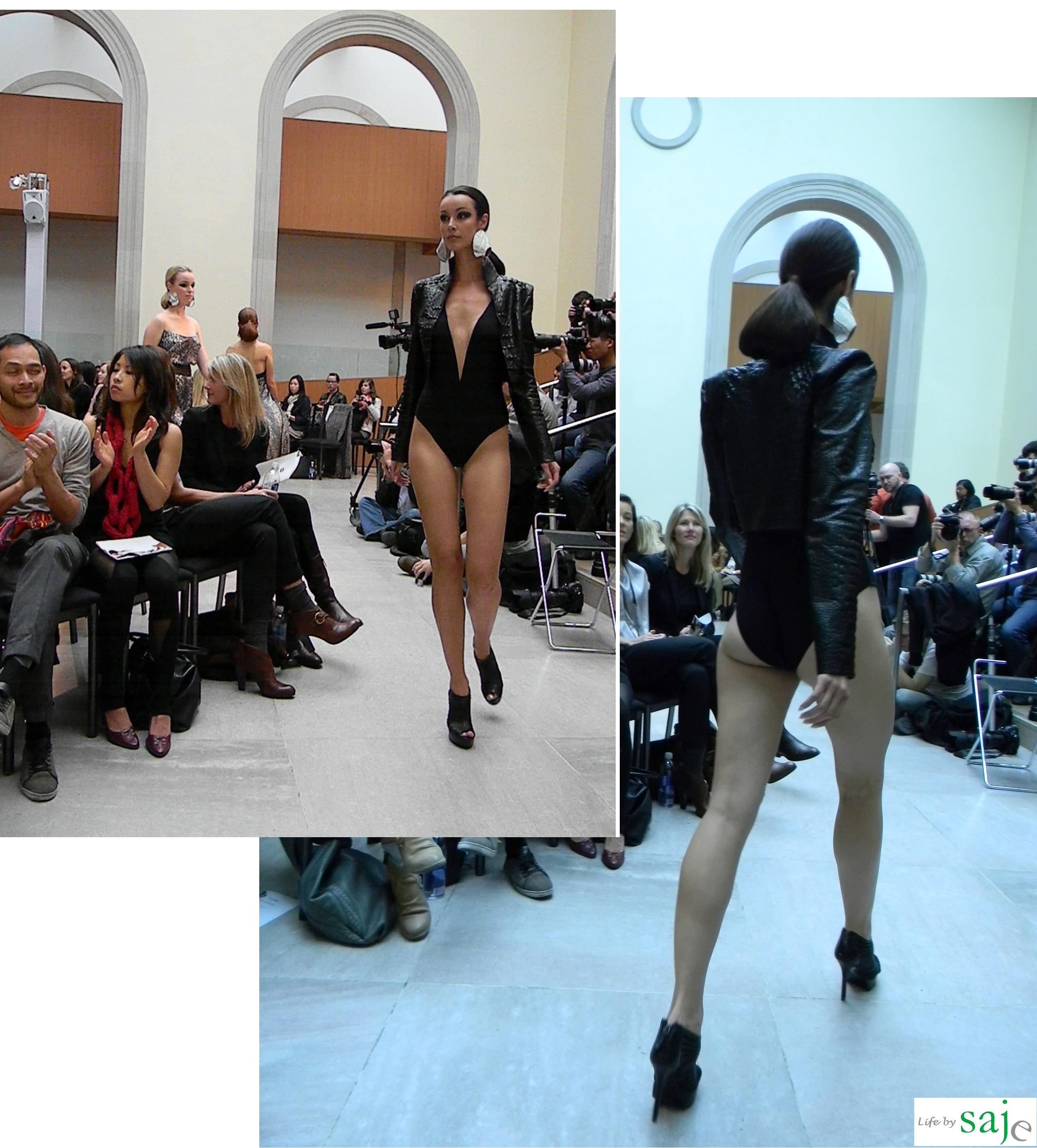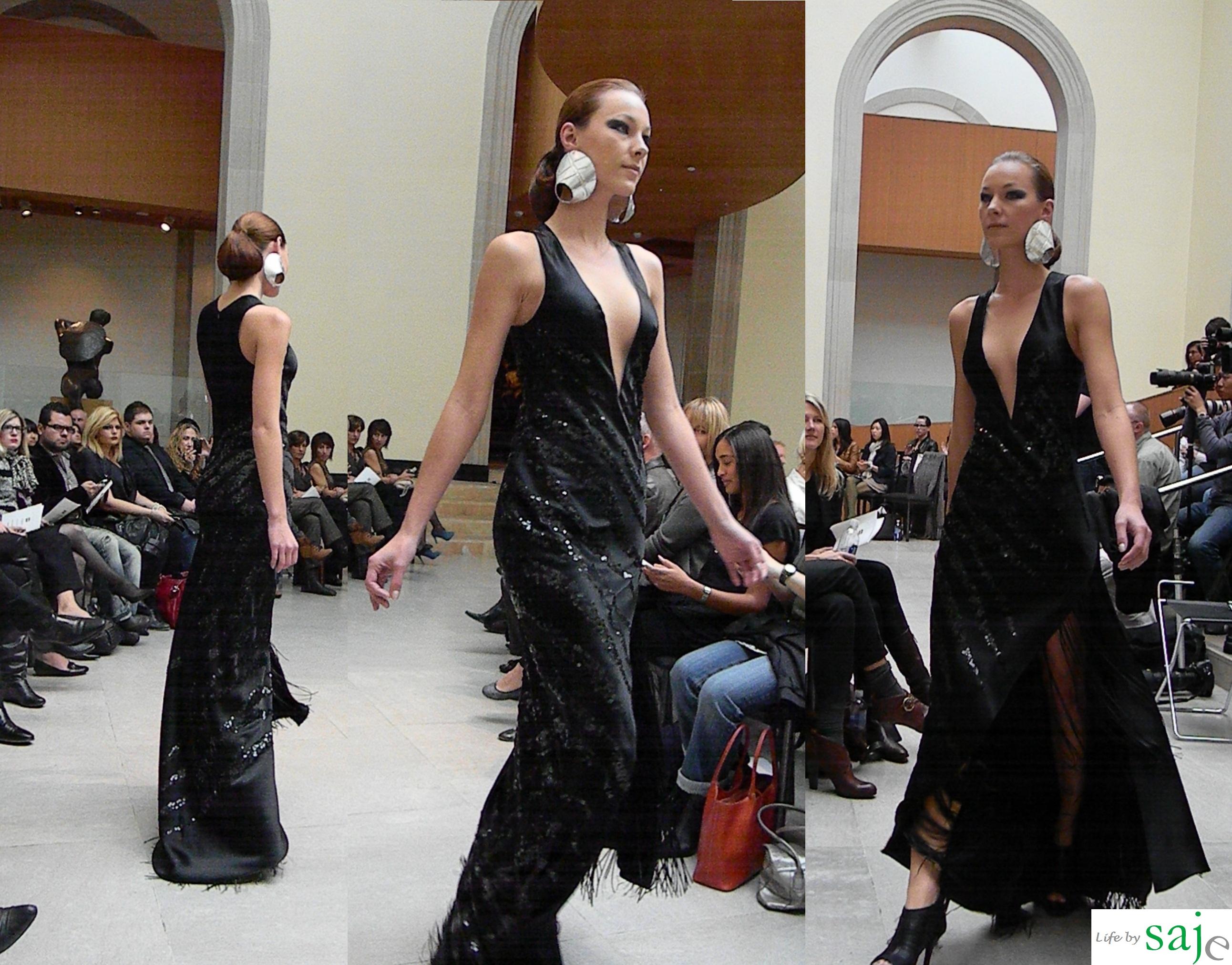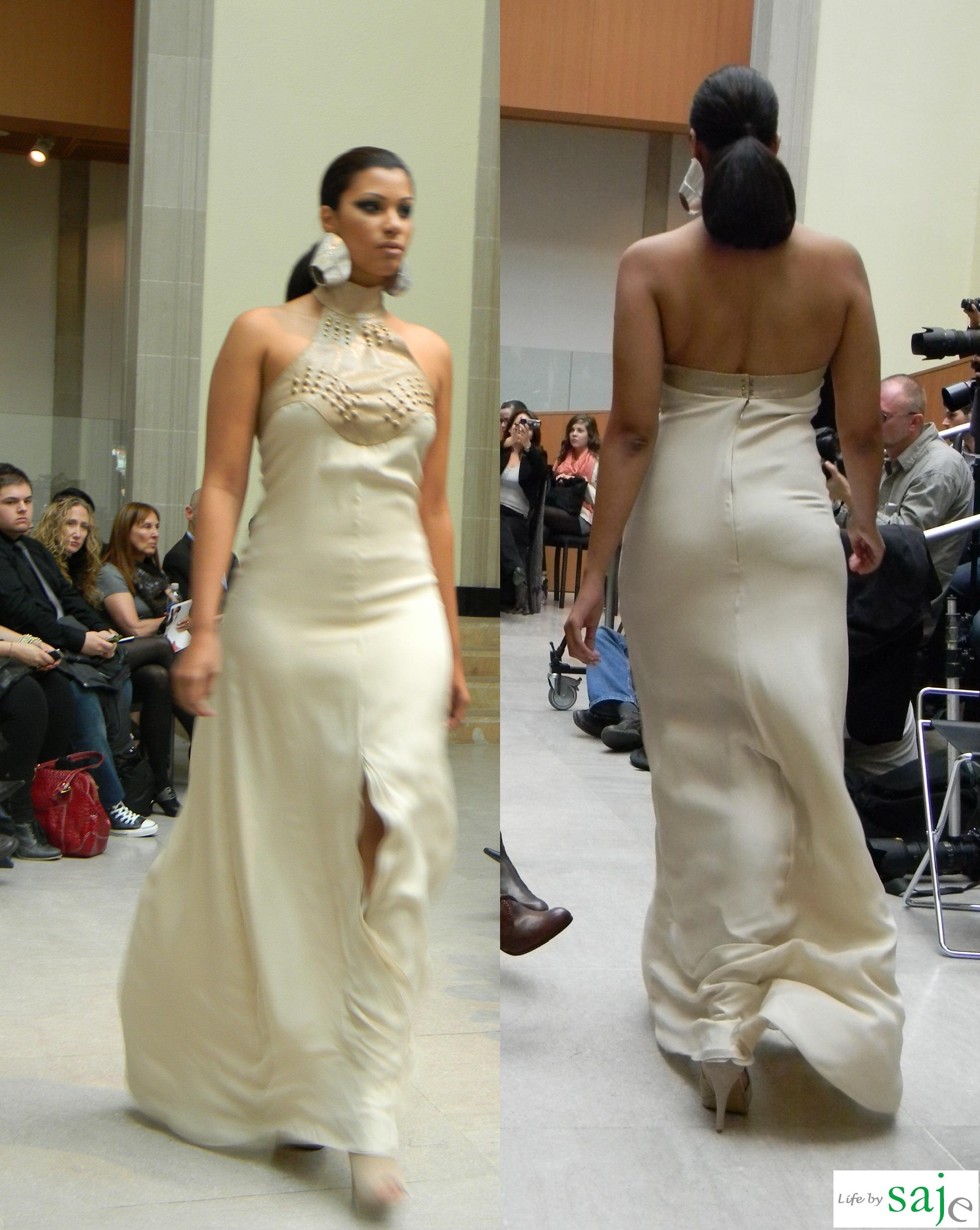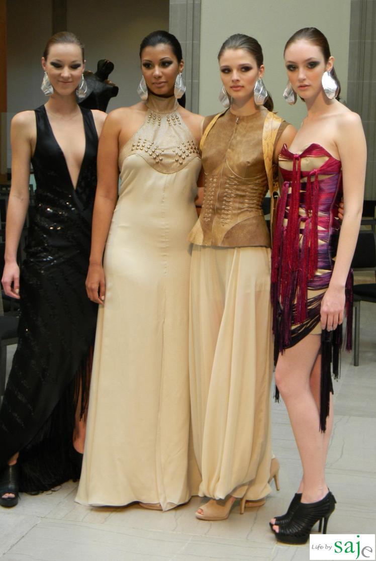 Today Canadian fashion designer Sunny Fong took us on a journey to Africa and Spain with his SS2011 collection for VAWK; inspired by his virtual tour of these amazing countries. The Toro Safari collection was a beautiful marriage between soft flowy feminine fabrics and buttery leather in shades of gold, cream and sand, mixed with dark animal prints and an amazing single pop of fuschia and purple for the strapless knotted fringe dress. The runway was set in VAWK’s favorite Toronto location at AGO’s Walker court.