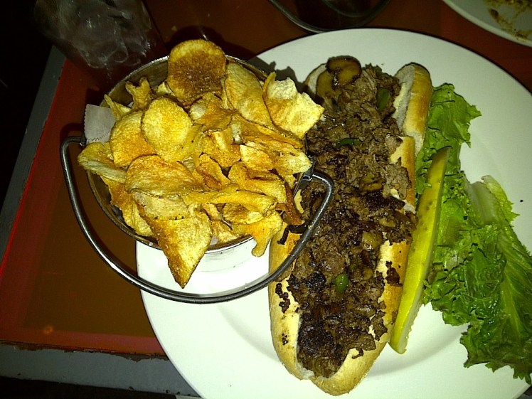 Philly Cheese Steak Sandwich ($10.75) – thinly sliced beef served with peppers, onions, mushrooms and American cheese and big bucket of homemade fries!