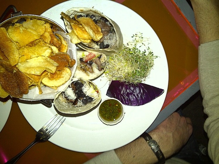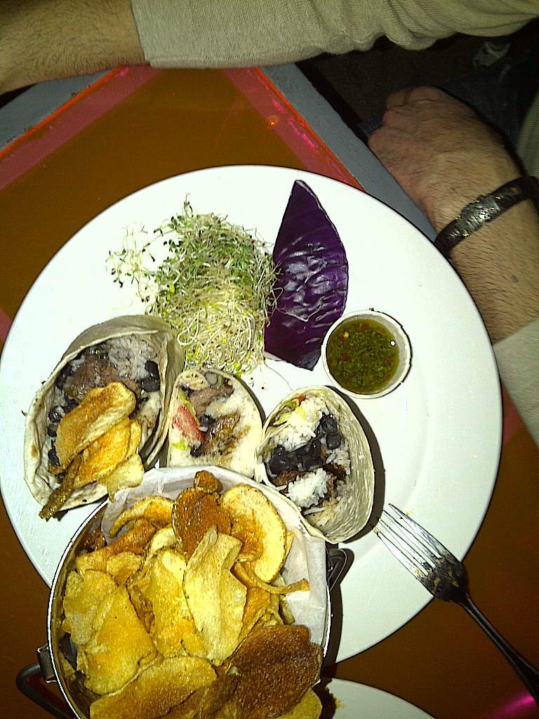 Churrasco Wrap ($10.50) – grilled skirt steaks, fried plantains, black beans, rice, Central American slaw served in a warm flour tortilla with chimichurri dipping sauce and a bucket of homemade fries.