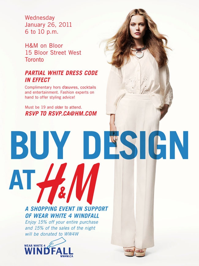 Buy Design at H&M, an exclusive shopping night with part of the proceeds going to Wear White 4 Windfall. Enjoy complimentary hors d’oeuvres, cocktails and entertainment. Shop their latest styles at 15% off, all while getting styling advice from Philip Sparks; designer, Philip Sparks Tailored Goods Inc.; Andrew Sardone, fashion editor, NOW Magazine; and Shawn Hewson, designer, Bustle Clothing! Reserve your spot now at RSVP.CA@HM.COM (must be 19 and older to attend). And remember, the more you shop, the more you support WW4W; 15% of the sales of the night will be donated to the campaign!