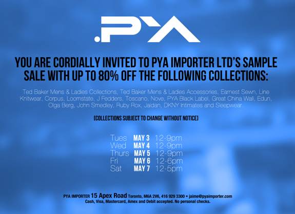 YOU ARE CORDIALLY INVITED TO PYA IMPORTER LTD’S SAMPLE SALE WITH UP TO 80% OFF THE FOLLOWING COLLECTIONS: