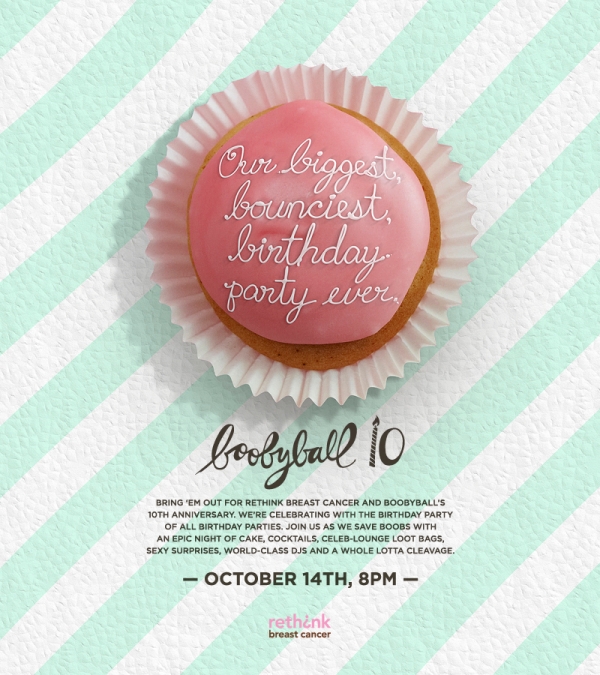 Pop the cork on the donkey, pin the tail on the bubbly and party like a 10-year-old gone wild as Rethink Breast Cancer and the Boobyball celebrate their Big 10 at the one and only BoobyBirthdayBash of the decade. We’re bringing the birthday party back in all its kitschy-kooky glory with an adults-only twist set to rock your knee socks off. 10 groundbreaking years only come around once in a lifetime, so shine up your best party shoes and be ready to take it over the top at our biggest, bounciest, boobyball bonanza ever!!!!
