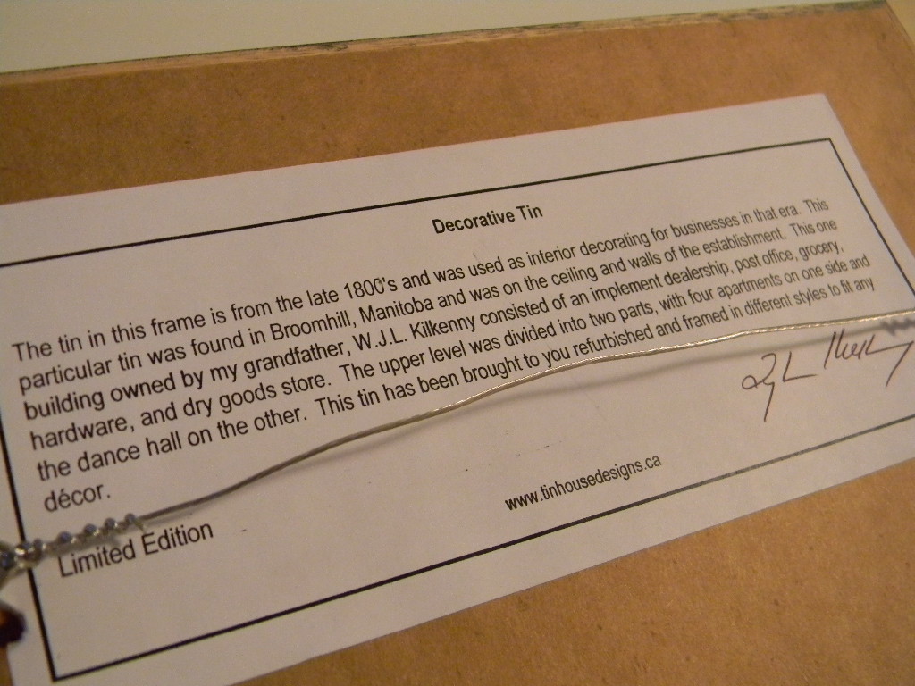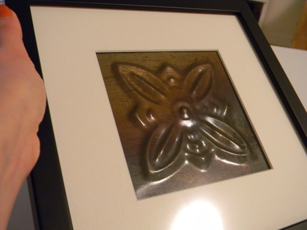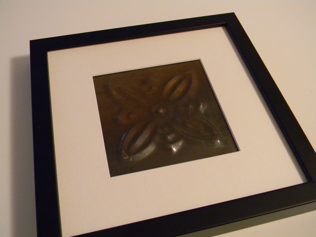 I found a great, unique art piece to add to my home. Framed oxidized tin tiles from TinHouse Designs are amazing. Tyler Kilkenny the artist behind these amazing pieces has brought together history, texture, beauty and uniqueness all in one place. They are so many sizes, designs and colors to these tiles, it was so hard for me to pick just one from many many variations. After visiting TinHouse’s booth at OOAKX11, I was ready to pick my favorite design and here it is.