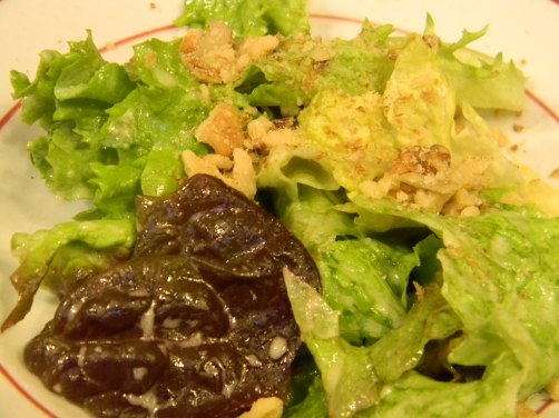 To start our delicious dinner, salad of lettuce with walnuts and mustard vinaigrette.